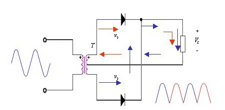 全波整流电路:利用副边有中心抽头的变压器和两个二极管构成如下图所示的全波整流电路,从图中可见,正负半周都有电流流过负载,提高了整流效率。