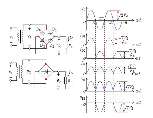 单相桥式整流电路是最基本的将交流转换为直流的电路,在分析整流电路工作原理时,整流电路中的二极管具有单向导电性。当正半周时,二极管D1、D3导通,在负载电阻上得到正弦波的正半周。当负半周时,二极管D2、D4导通,在负载电阻上得到正弦波的负半周。在负载电阻上正、负半周经过合成,得到的是同一个方向的单向脉动电压。
