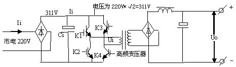 由电路可以看出,市电经整流滤波后变为311V高压,经K1~K4功率开关管有序工作后,变为脉冲信号加至高频变压器的初级,脉冲的高度始终为311V。当K1,K4开通时,311V高压电流经K1正向流入主变压器初级,经K4流出,在变压器初级形成一个正向脉冲,同理,当K2,K3开通时,311V高压电流经K3反向流入主变压器初级,经K2流出,在变压器初级形成一个反向脉冲。这样,在变压器次级就形成一系列正反向脉冲,经整流滤波后形成直流电压。当输出电压Uo较高时,脉冲宽度就宽,当输出电压Uo较低时,脉冲宽度就窄,因此开关管实际上是一个控制脉冲宽窄的装置。